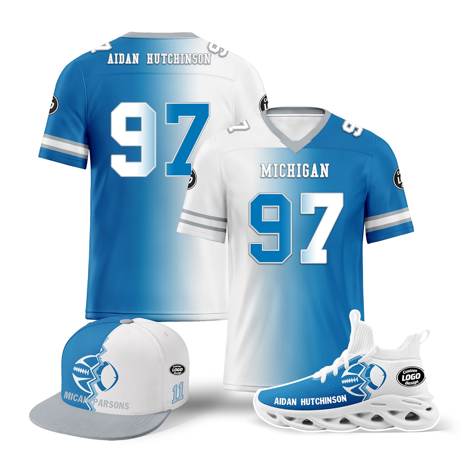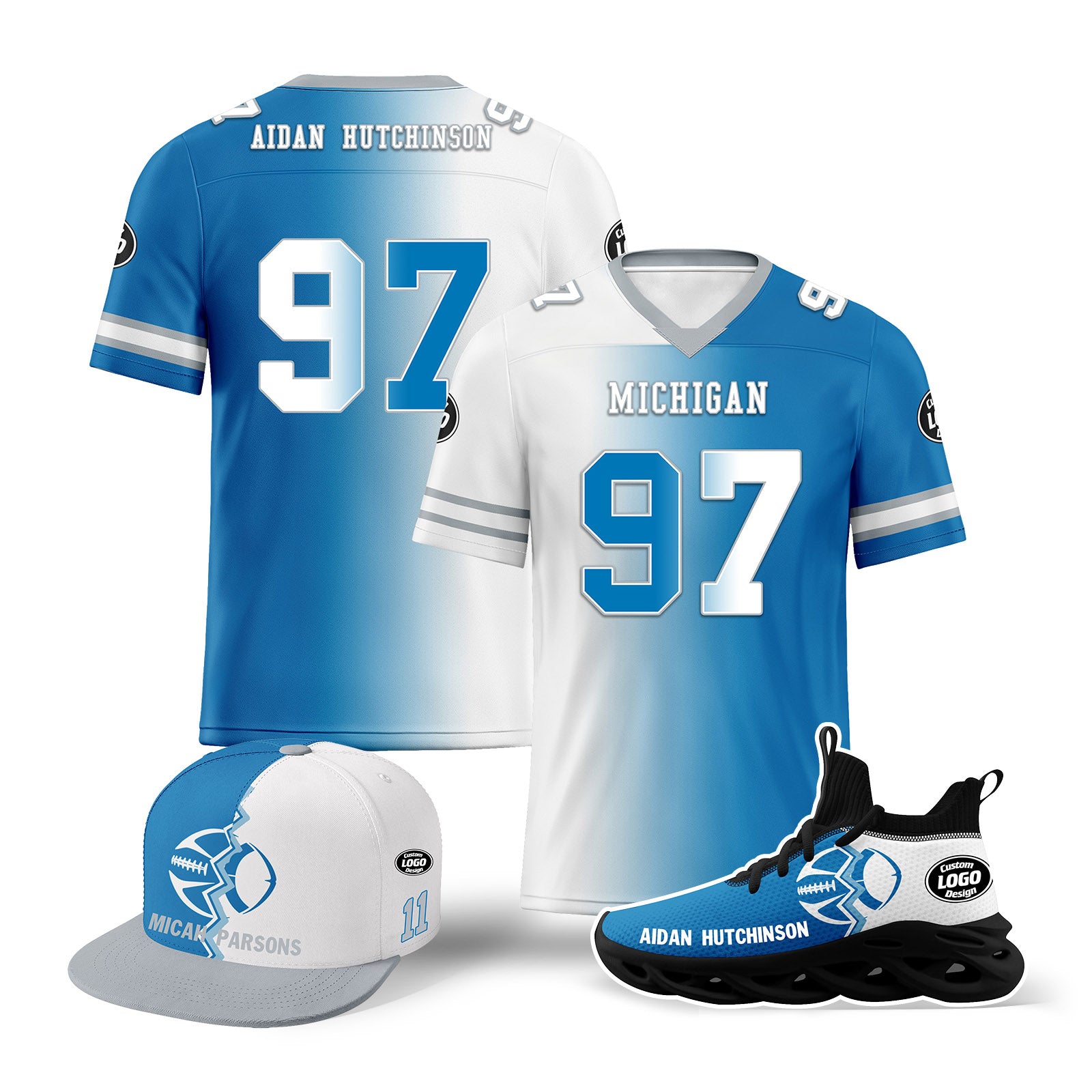 Custom Blue White Michigan Football Jersey MaxSoul Shoes and Hat Combo Offer Personalized Combo ZH-D028018-6