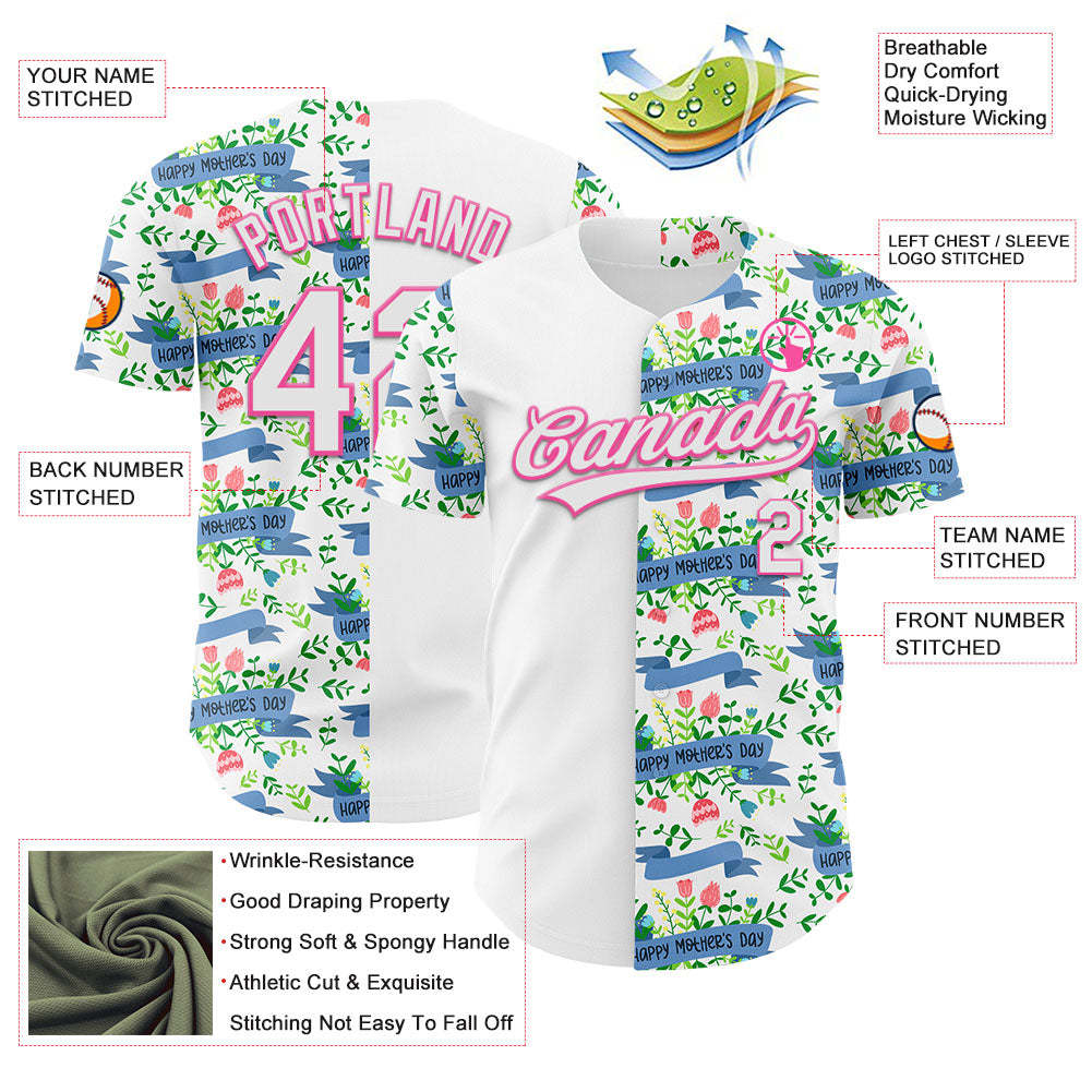 Custom White Pink 3D Pattern Design Mother's Day Flower Authentic Baseball Jersey